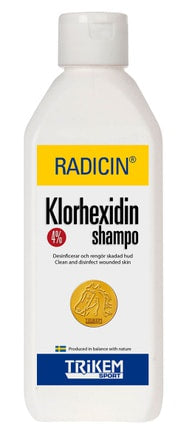 Massage Klorhexidinshampoo into the coat or on skin and leave in for 10-15 minutes.
