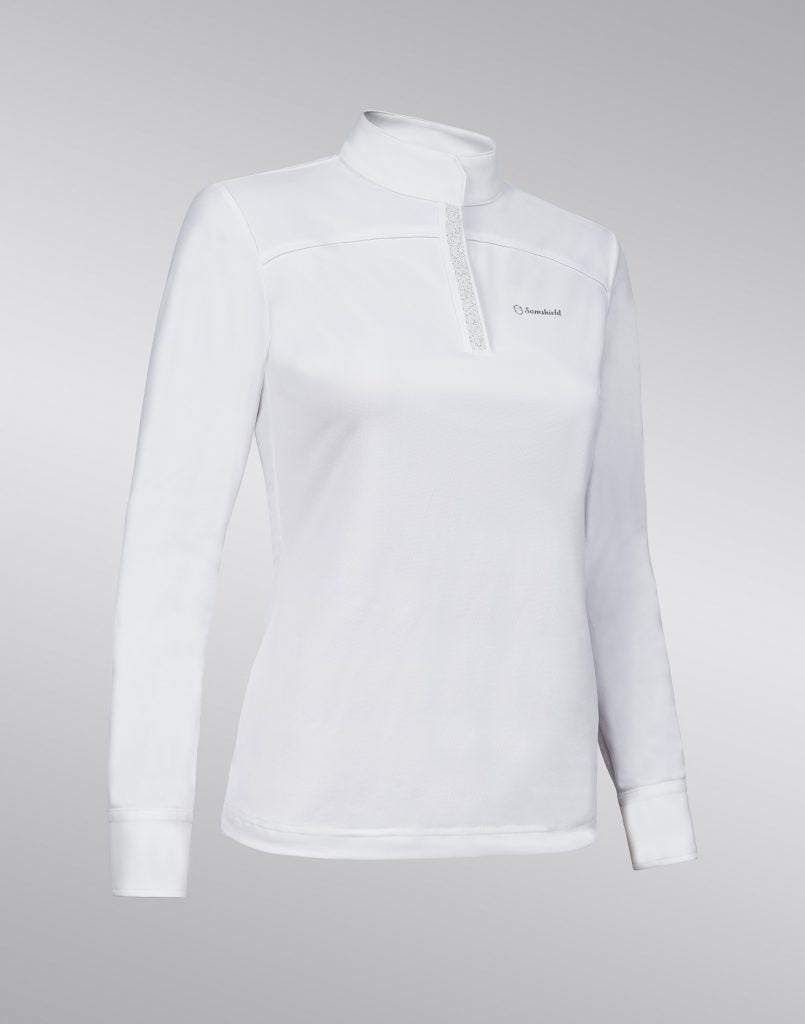 The Marie long sleeves shirt is made with pique cotton. This soft high stretch fabric provides high breathability and comfort to wear. The collar closes with a button and small snaps which are hidden when the collar is closed. The tailored fit of the shirt provides elegance and perfect