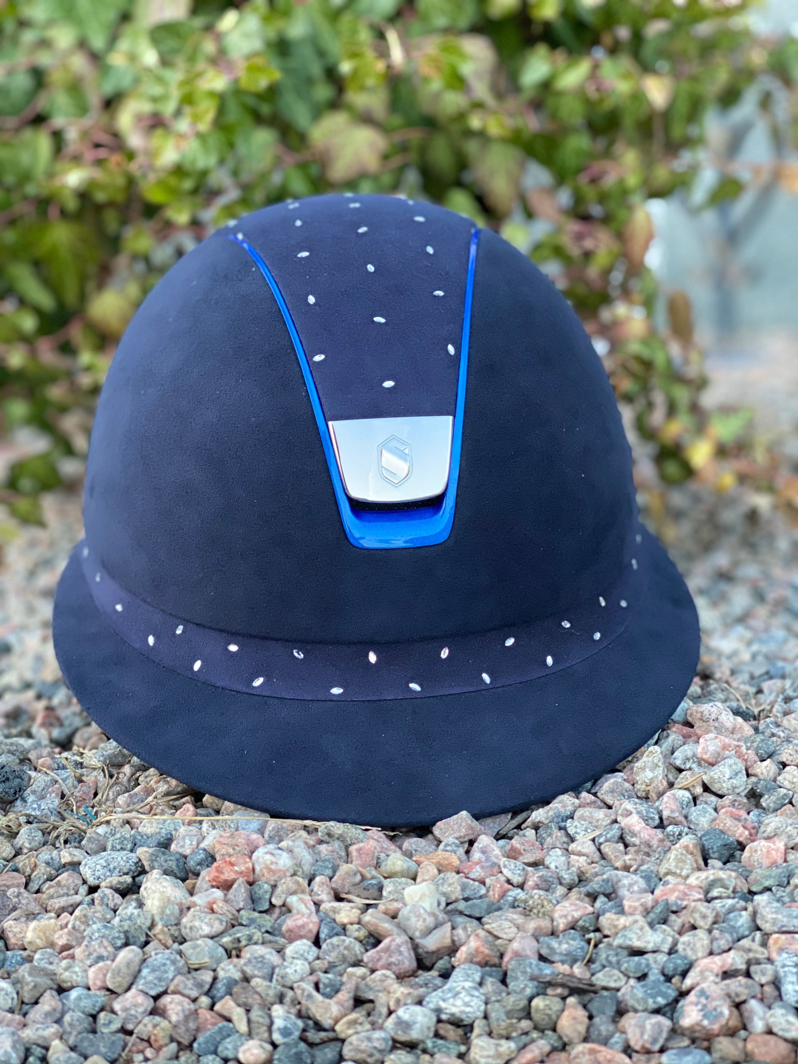 The stunning Crystal Medley top and frontal band features the blue Swarovski crystal fabric with even more Swarovski crystals encrusted on the fabric in a scatter effect. Combine this with the longer visor and frontal band of the Miss Shield for an elegant, feminine look with maximum sparkle.